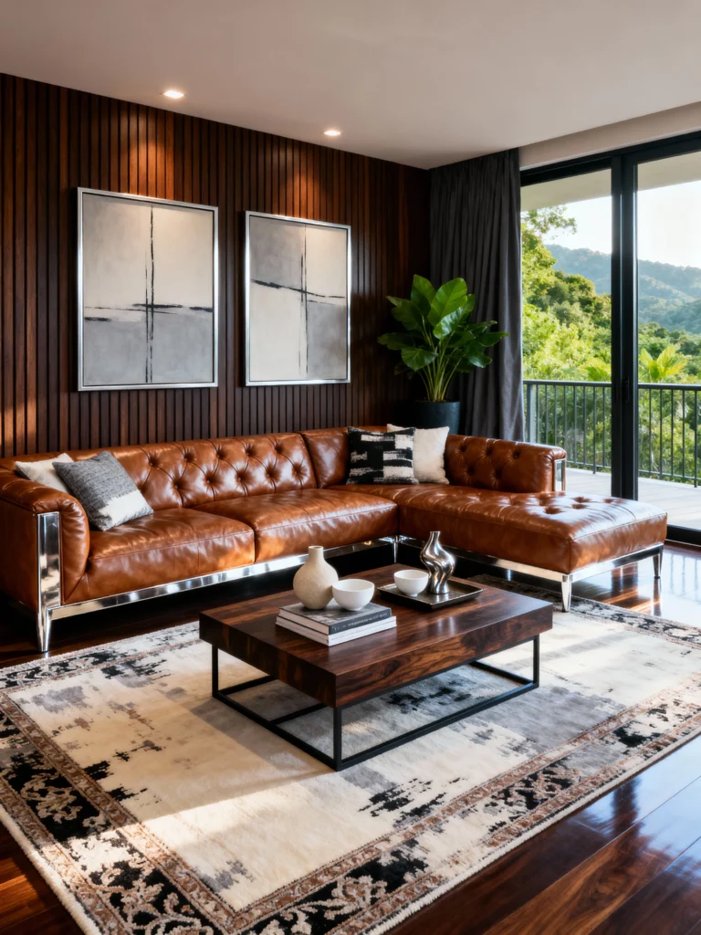 This space is sleek, masculine, and totally luxurious. That buttery-soft, tufted brown leather sectional is the star, giving off major high-end vibes. It’s set against dark, vertical wood paneling, which adds a fantastic architectural texture and a moody backdrop. The modern, low-slung dark wood coffee table and the abstract black and white rug keep the look clean and contemporary. It’s a chic, polished spot for conversation or just admiring that view!