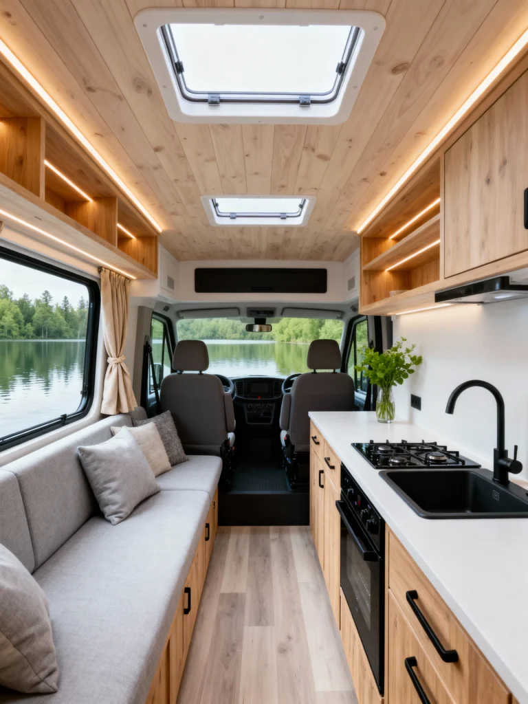 This is a fantastic example of a functional and beautiful layout in a standard van. The long sofa on one side is perfect for lounging and entertaining, and it likely converts into a bed. The kitchen area on the opposite side is well-equipped with a stovetop and oven, making it great for actual cooking. I adore the open shelving with the strip lighting—it’s a genius way to display a few items and keep the space from feeling too closed in. The two roof vents will keep the air fresh, and look at that view out the back!