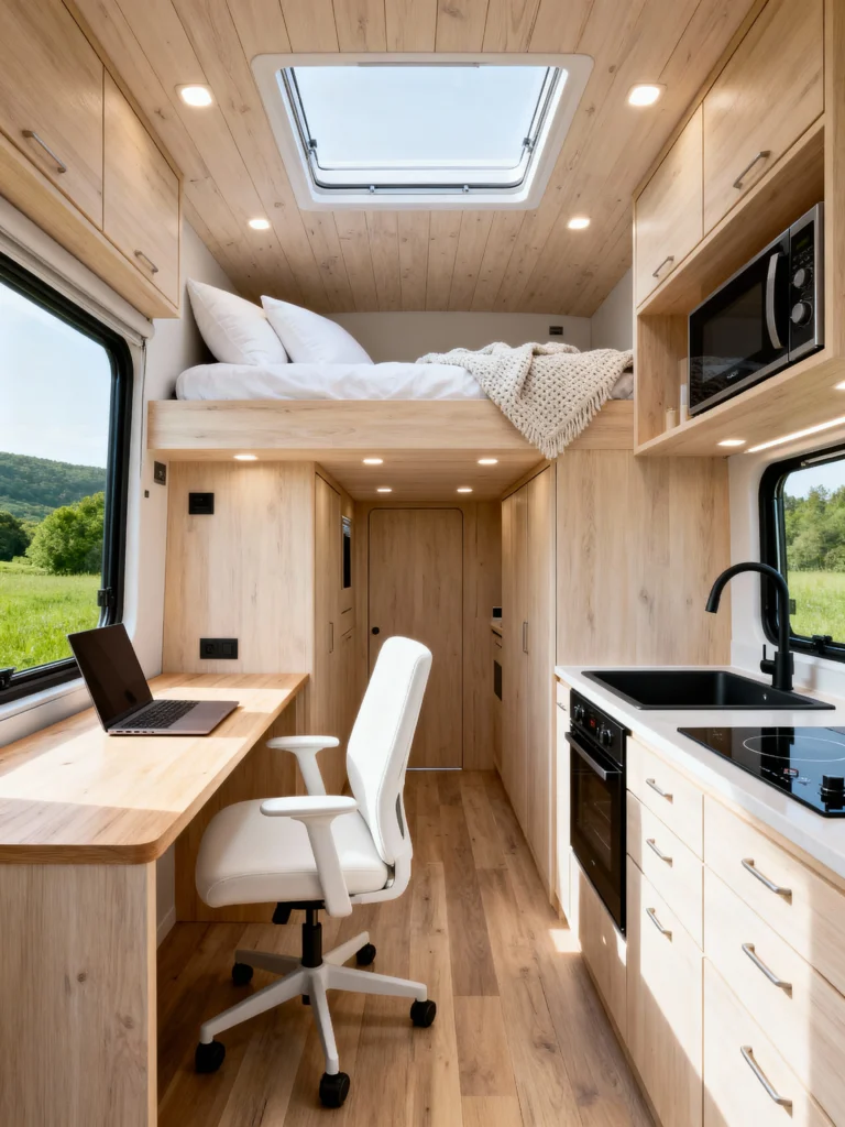 This setup is perfect for the serious digital nomad! Who wouldn’t want this view while working? The light wood and white surfaces keep the space feeling bright and airy, even with a lofted bed maximizing the vertical space. The dedicated desk area with a comfy-looking chair turns a corner of the van into a functional home office. Plus, that huge skylight above the bed? Absolute perfection for stargazing or letting in natural light while you relax after a long day of work (and driving!). Everything is tucked away neatly, proving that productivity and cozy living can go hand-in-hand in a small space.