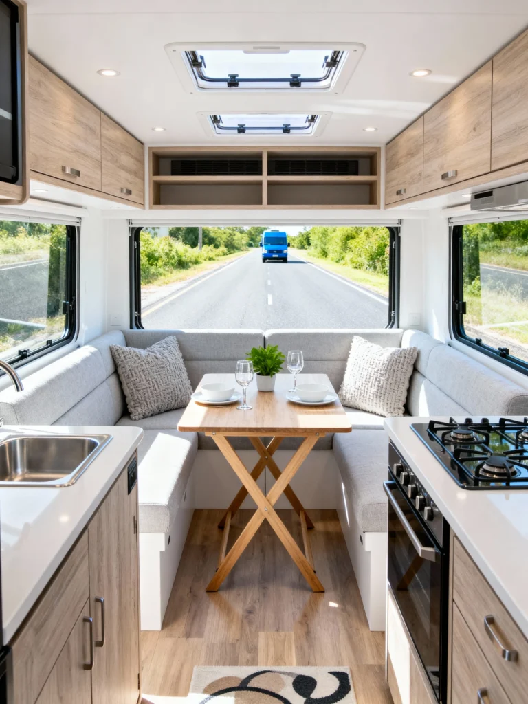 This is a clever use of space, putting the dinette right in the middle of the van! It’s a great place to sit down for a meal with fantastic views out of the large side windows. The foldable wooden table is a practical choice, allowing you to easily convert the space for different activities. You have the galley kitchen on both sides, which is brilliant for separating cooking and cleaning areas. The light colors and matching wood trim make the whole space cohesive and bright, proving you can have a full-size table and a full kitchen!