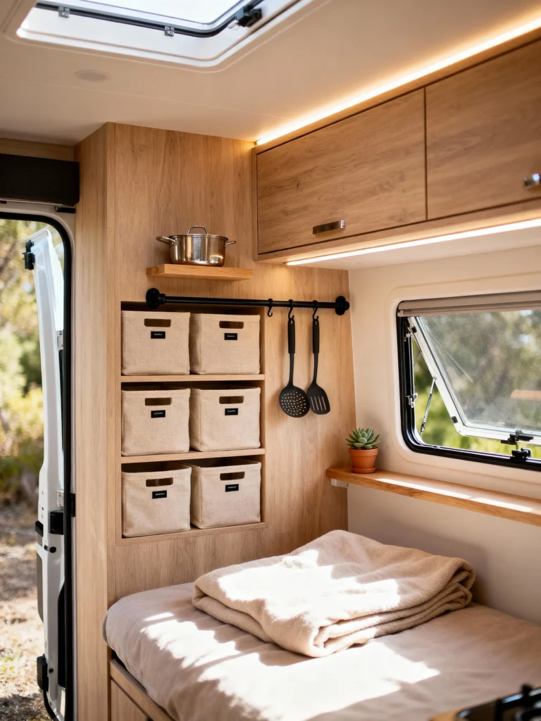 This is the ultimate example of combining comfort with practical storage. The earthy tones and plush blanket make this bed area look so inviting—a perfect spot to crash after a day of exploring. I love how they’ve utilized that little wall nook for smart storage! Those linen-look canvas bins keep all the essentials organized and out of sight, while the bar and hooks are a genius way to hang up utensils or even coats. The small shelf with the succulent adds a nice touch of green, reminding you that even in a van, you can bring nature inside.