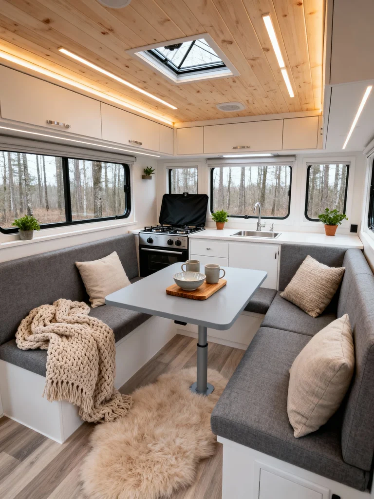 Wow, this feels less like a van and more like a high-end studio apartment! The U-shaped dinette is an absolute game-changer for socializing and dining. The dark grey cushions provide a beautiful contrast to the white cabinets and the warm wooden ceiling. That table looks like the perfect spot for dinner or even a board game night. The long strip lighting along the ceiling is a sleek touch, providing great ambient light. And let’s not forget the stove and sink right there—everything you need for a gourmet meal after a day in the woods!