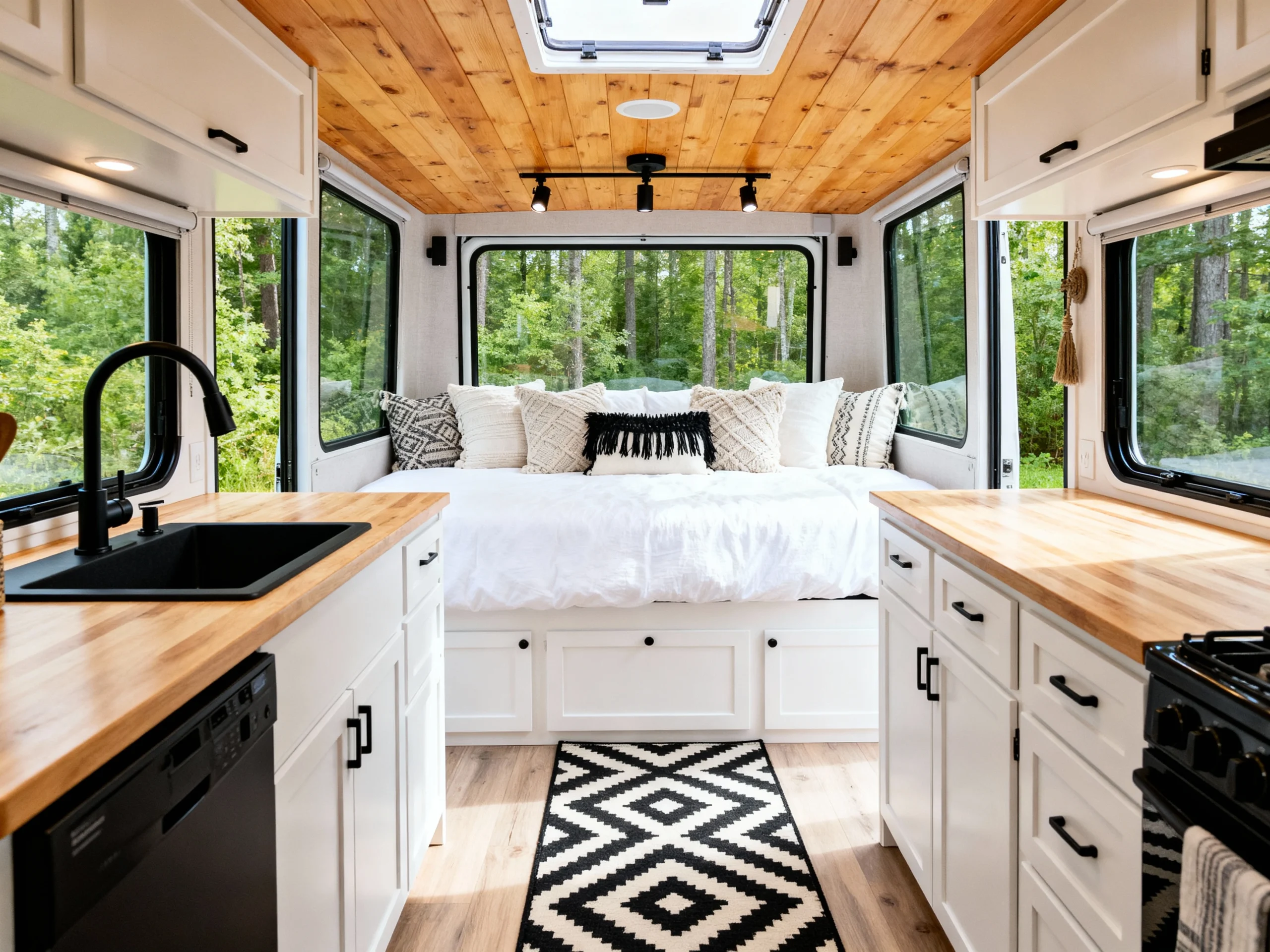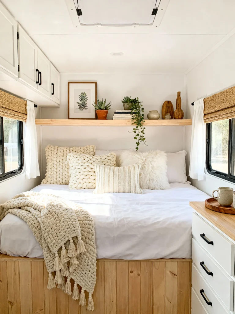 This is pure boho-chic van life! The cozy, all-white bedding and those incredible chunky knit pillows make this feel like a high-end retreat, not a tiny home on wheels. The texture from the woven shades and the wood paneling brings in such a warm, natural vibe. I love the simple, uncluttered shelving above the bed—it’s the perfect spot for personal touches like plants and framed art. This design shows you don’t have to sacrifice style for function; it’s a bright, gorgeous space to wake up in every morning.
