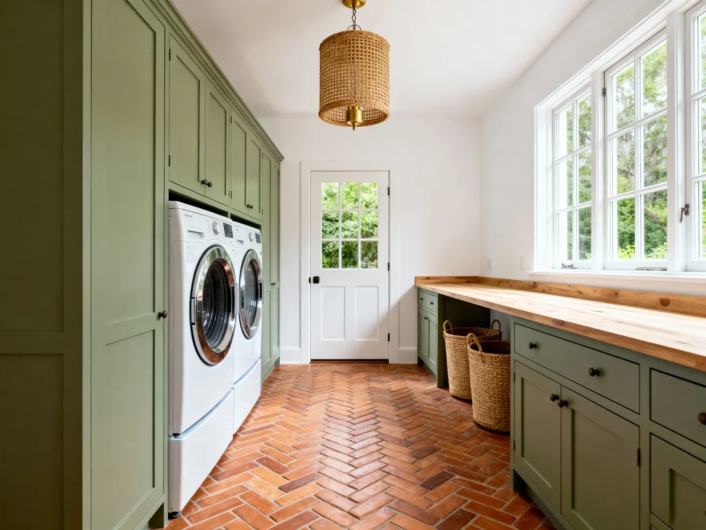 Talk about a statement! If you’re tired of all-white, this sage-green cabinetry is an absolute dream. It brings such a fresh, earthy vibe to the room. I love how the warm, herringbone brick floor and that woven rattan light fixture complement the green so perfectly. Having a full wall of tall cabinets is fantastic for storage, and the long butcher block counter over the lower cabinets provides a huge, gorgeous workspace for folding. Plus, that back door with the glass panes is just lovely!