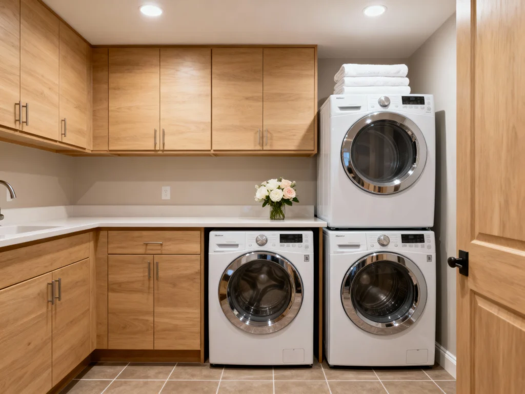 If you’re working with a tighter space, take notes! Stacking the washer and dryer vertically is a smart way to maximize your floor plan, but here, they’ve kept one set side-by-side underneath the counter, which is genius. The light oak cabinets are modern and clean, offering plenty of storage. It looks like a super functional, easy-to-navigate layout—perfect for a busy household!