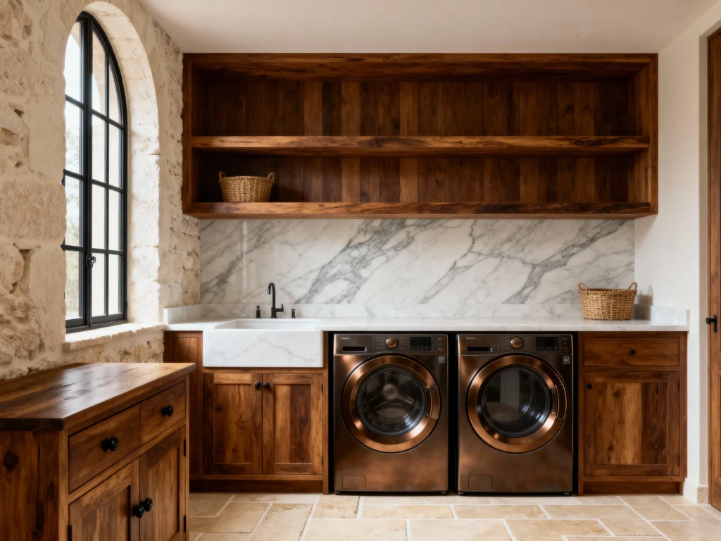 This room is pure drama and luxury! The rich, dark wood cabinetry and shelves are stunning, creating a cozy and sophisticated mood. That incredible floor-to-ceiling marble backsplash is the absolute showstopper here—it elevates the entire space. It perfectly balances the deep tones of the wood and the rustic stone wall on the left. The bronze-colored washing machines just blend right into the rich color palette. This is definitely a laundry room fit for a villa!