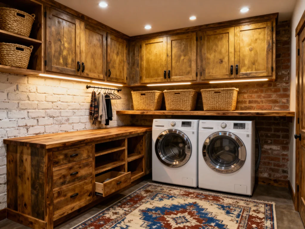 This space is giving me major cabin-in-the-woods vibes, and I’m here for it! The distressed, dark wood cabinets and counters are full of character, especially against the exposed white and red brick walls. The clever use of open shelving for baskets and a built-in hanging rod for drying delicate items makes it super practical. The warm lighting and patterned rug really tie the cozy, rustic look together!