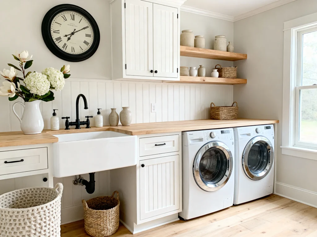 This room just screams timeless elegance, doesn’t it? The clean white cabinetry, paired with the rustic wood shelves, creates that perfect balanced look. But the real star is that classic apron-front farmhouse sink with the chic black faucet—it’s gorgeous and practical. A great big wall clock is a brilliant addition for keeping track of cycle times (or just making a statement!). Everything is so organized and light; it makes doing a load of clothes feel like a mini retreat!