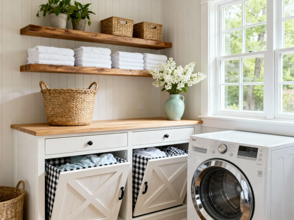 The crisp white beadboard walls and cabinetry are beautifully warmed up by those chunky natural wood floating shelves and butcher block countertop. I am obsessed with the clever tilt-out hampers hidden in the lower cabinets! Not only does it keep the dirty laundry tucked away, but the black-and-white gingham lining adds such a charming, playful touch. And look at that natural light flooding in—it’s practically begging for a peaceful afternoon of folding!