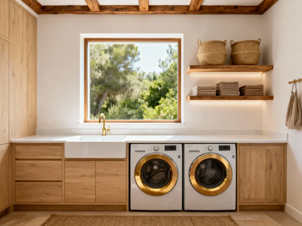 This space is giving me major Mediterranean vacation vibes! The light wood cabinetry is so sleek and modern, and the open-beam ceiling adds that lovely rustic texture. Notice how the appliances themselves have a stylish gold trim? It’s a super unique detail! The under-shelf lighting is a fantastic way to brighten up the workspace and show off those neatly folded towels. A beautiful, large window lets in tons of sun, making the whole room feel open and airy.