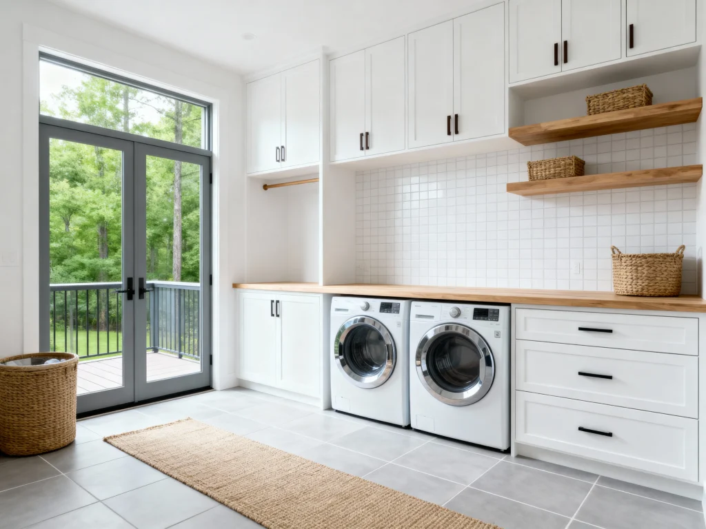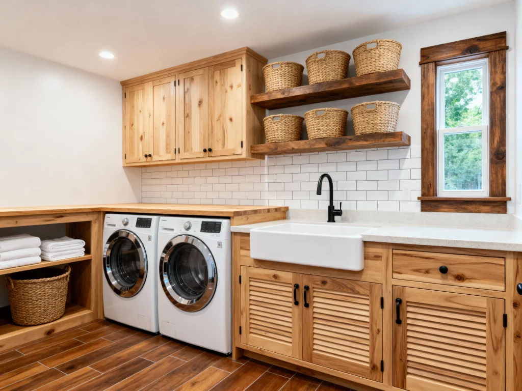 Seriously, it’s gorgeous! The mix of natural wood cabinetry and open shelving gives it such a warm, modern farmhouse feel. I love how they paired the rustic wood tones with crisp white subway tiles—it’s the perfect contrast! Having the front-loading washer and dryer tucked neatly under a countertop is brilliant for folding, and that deep farmhouse sink is just begging for some pre-treatment soaking. Plus, the woven baskets on those floating shelves add a lovely texture and hide all the bits and bobs. It shows that even the most hardworking rooms can be beautiful!