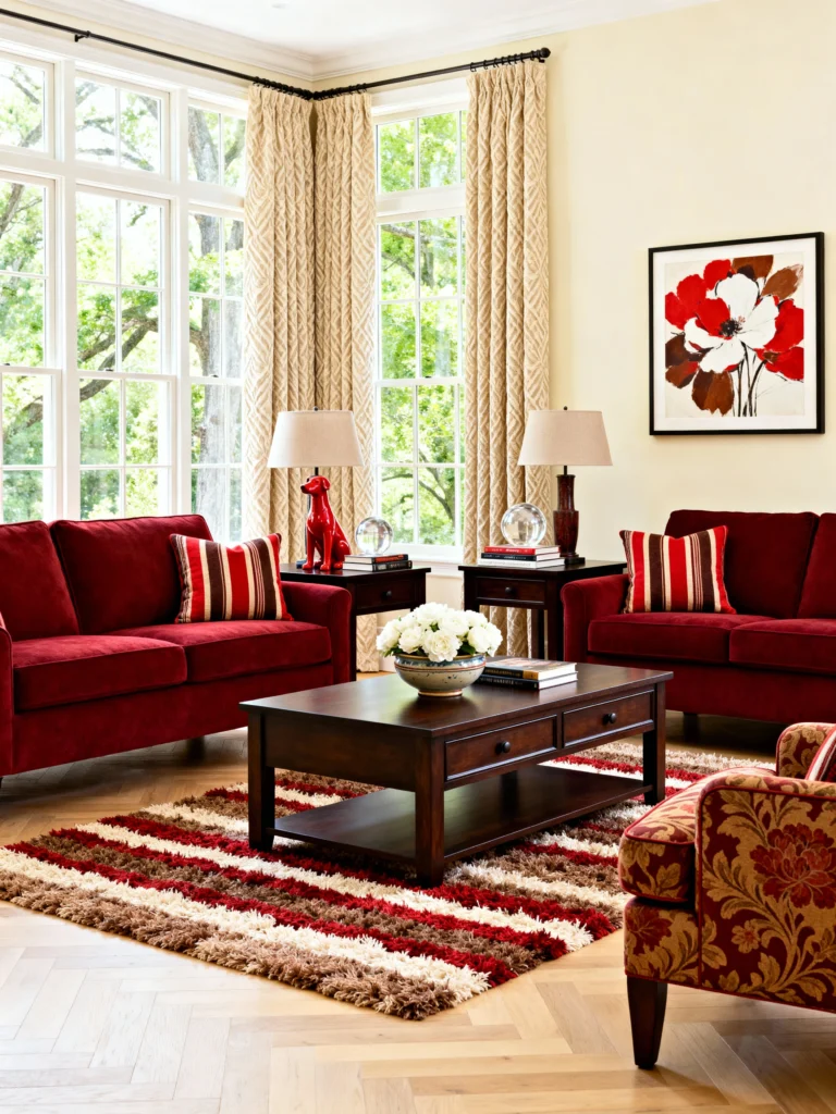 This room feels so cheerful and inviting! The clean-lined red sofas are set against light walls and a stunning backdrop of bright windows, keeping the feel relaxed. The colorful, striped rug and the patterned armchair introduce variety and make the room feel lived-in and comfortable. The dark wood coffee table and side tables add a nice contrast, balancing the brightness. It’s a casual, family-friendly space that still makes a lovely statement.