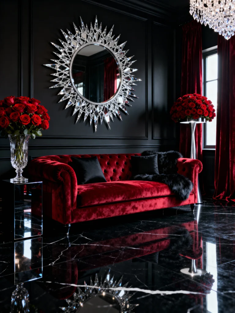 Okay, if you want drama, look no further! This deep, tufted velvet sofa against the glossy black walls and marble floor is pure Hollywood Glamour. The crystal chandelier, that incredible spiky sunburst mirror, and the rich velvet curtains elevate the room to a whole new level of luxury. The pops of black with the pillows and fur throw keep the look edgy and modern. It’s moody, striking, and totally unforgettable—perfect for hosting a fabulous evening!