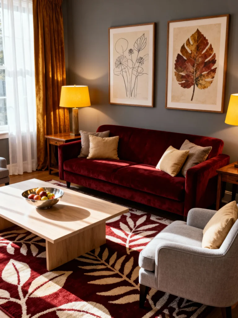 This setup is giving me all the cozy, sophisticated fall vibes. The deep, ruby velvet of the sofa is beautifully complemented by the warm mustard-yellow lamps and the rich, rust-colored curtains. I love how the creamy gold and beige throw pillows connect the sofa to the oversized botanical art prints above. The whole room feels rich and grounded, with the leafy rug echoing the autumn colors. It’s the perfect place to curl up on a chilly afternoon!
