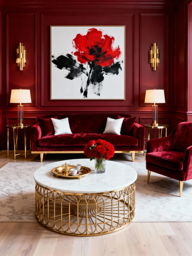 Talk about bold and sophisticated! Painting all the wainscoting and trim in that deep, luscious cranberry red is a brave move that totally pays off. The velvet sofa and accent chair blend seamlessly with the walls, letting the crisp white pillows and the dramatic, oversized poppy artwork truly pop. And can we talk about that gold-caged coffee table and the sleek brass lamps? The gold accents inject a touch of regal elegance. It’s a masterclass in monochrome luxury!