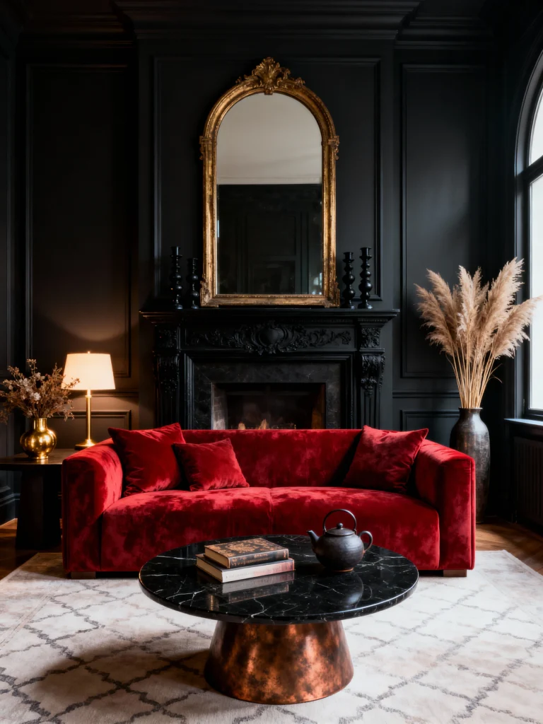 This room proves that black and red are an undeniable power couple. The sleek, contemporary red velvet sofa looks incredible against those dramatic black paneled walls and the dark, ornate fireplace. The tall, spiky pampas grass adds a natural texture, while the show-stopping antique gold mirror over the mantel is the perfect classic counterpoint to the modern sofa shape. The black marble coffee table completes the moody, high-end, and utterly chic vibe.