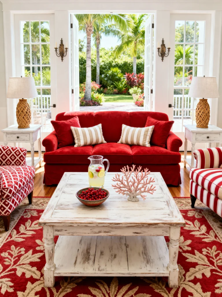 This bright, slipcovered sofa brings a lively energy, contrasting beautifully with the distressed white furniture and light wood floors. The white and tan striped pillows and the patterned accent chairs add a playful, resort-style feel. With those French doors opening onto a tropical garden, the red feels happy and vibrant, not heavy. That distressed coffee table and the piece of coral are just the perfect coastal touches!