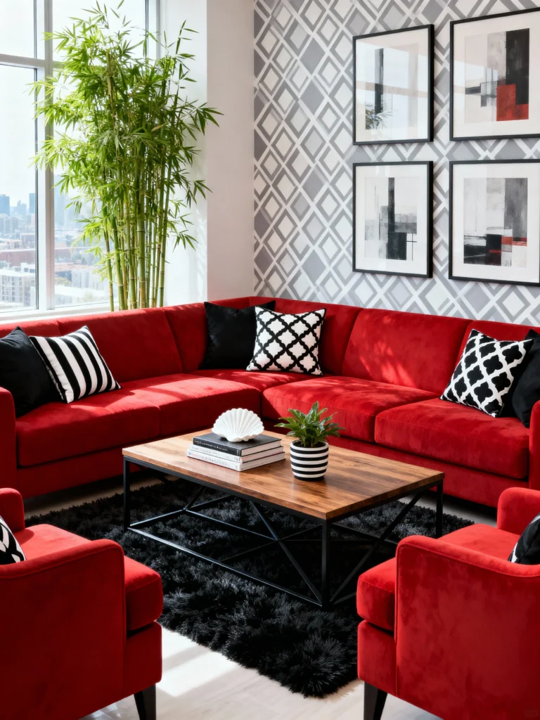 This space is so fresh and modern! The clean lines of that massive L-shaped sectional are softened by the playful mix of black and white graphic pillows. The geometric wallpaper behind the artwork is a cool, contemporary backdrop, and the huge window with the vibrant green bamboo brings life and a great view into the city living room. The shaggy black rug grounds the entire seating arrangement, making the bright red pop even more.