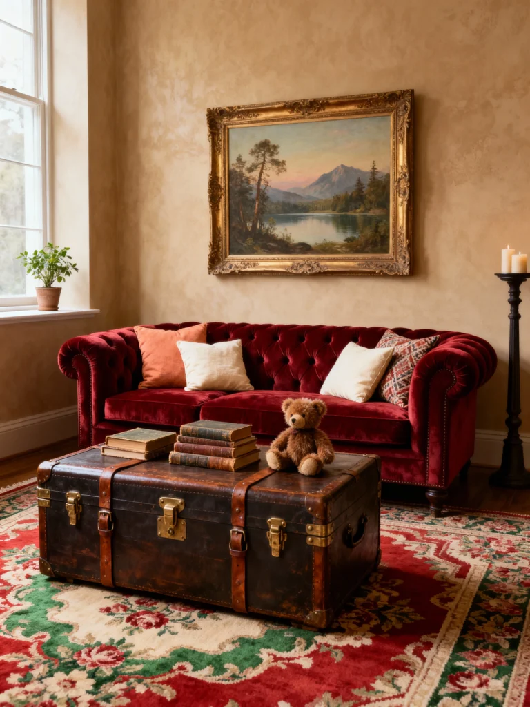 This is a beautiful example of a classic, deep red tufted velvet sofa feeling totally at home in a traditional, warm setting. The antique trunk used as a coffee table is brilliant—it adds history and incredible texture. The gorgeous landscape painting in the ornate gold frame and the richly patterned area rug tie together all the warm, earthy tones on the stucco walls. It feels historic, cozy, and perfectly curated.