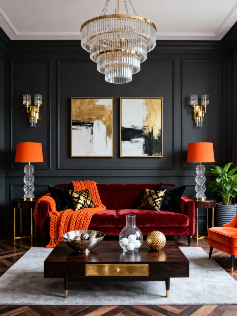 I absolutely love this color combination! The deep, luxurious burgundy velvet sofa is paired with vibrant orange accents—that knit throw and the incredible lampshades—creating a truly unique and stylish space. The gold in the abstract paintings and the breathtaking tiered crystal chandelier add sparkle and glam against the dark, moody walls. This room is a perfect example of using rich jewel tones for a high-impact, sophisticated look.