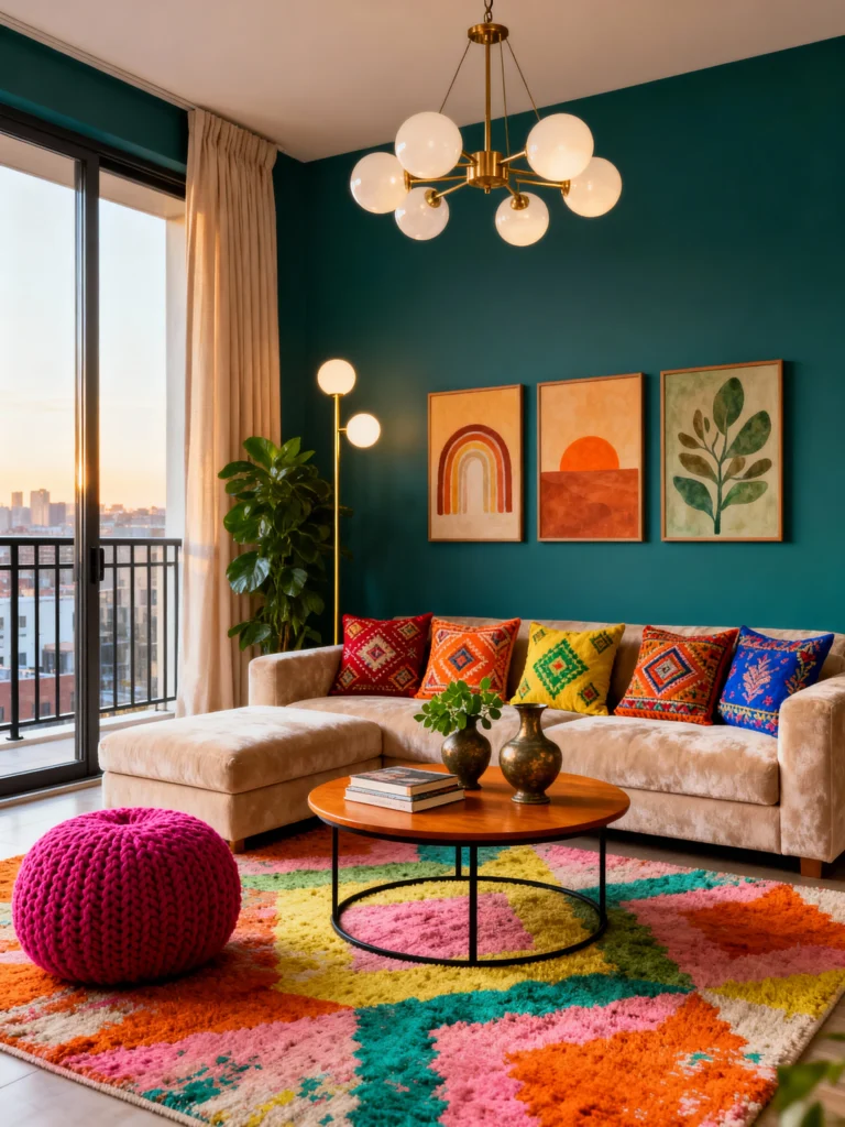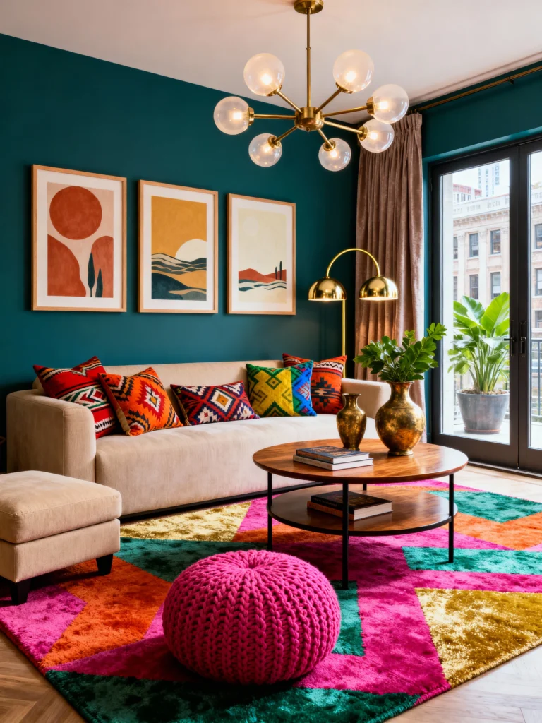 This room is a masterclass in using a rug as the “fifth wall.” That vibrant, geometric shaggy rug is so loud and fun, yet it works perfectly with the calm cream sofa and the deep teal accent wall. The brass accents in the lighting and vases add a touch of luxury. It’s a perfect example of how you can mix different “vibes”—boho, modern, and glam—to create something totally unique.