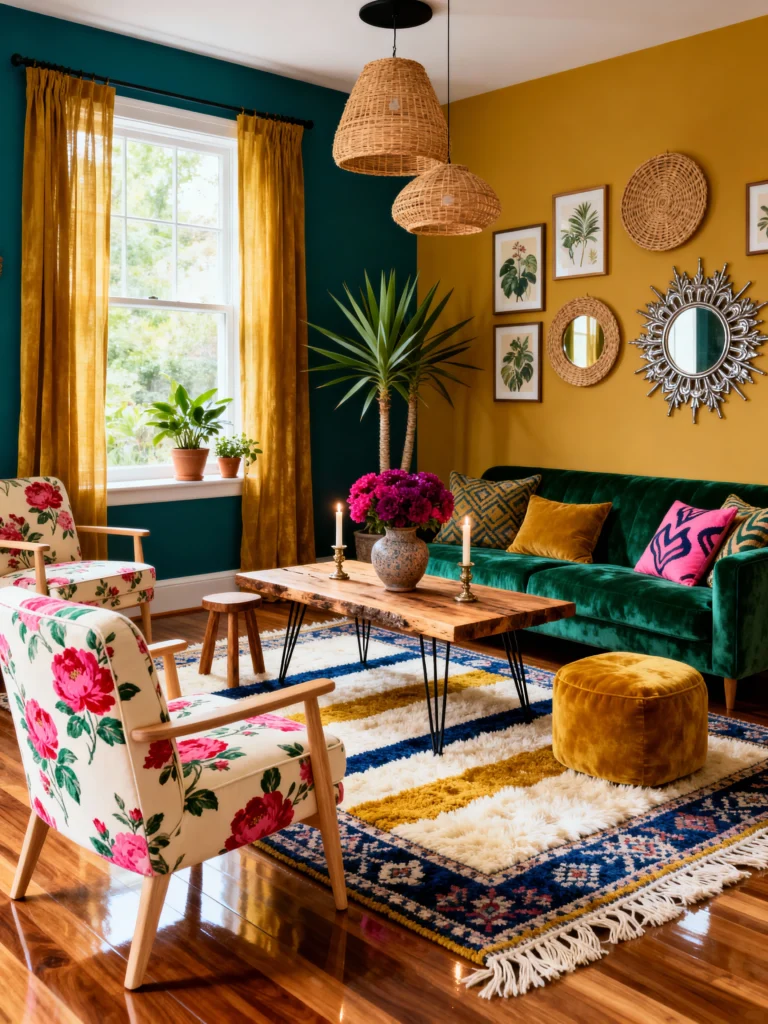 I love the “split personality” of these walls! Mixing a moody teal with a sunny mustard yellow is such a bold move, and it totally works. The natural textures—like the woven pendant lights and that live-edge wood coffee table—really ground the room so the bright colors don’t feel overwhelming. And those floral armchairs? They add just the right amount of vintage charm to keep things interesting.