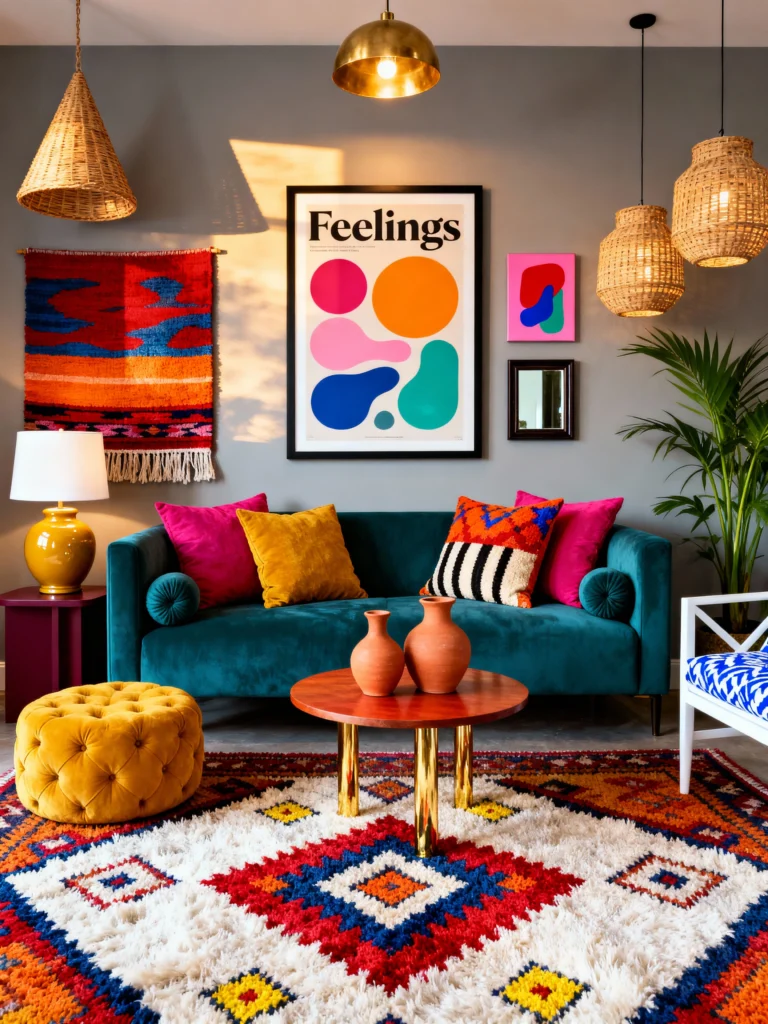 This space is all about the “Feelings”—literally! That graphic poster is such a great starting point for the room’s color palette. I’m obsessed with the mix of the shaggy geometric rug and the sleek teal sofa. It feels very “boutique hotel” but totally livable. The pink and orange accents bring a playful energy that makes you want to host a cocktail party immediately.