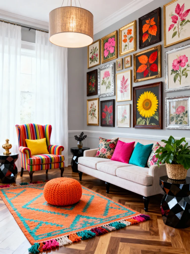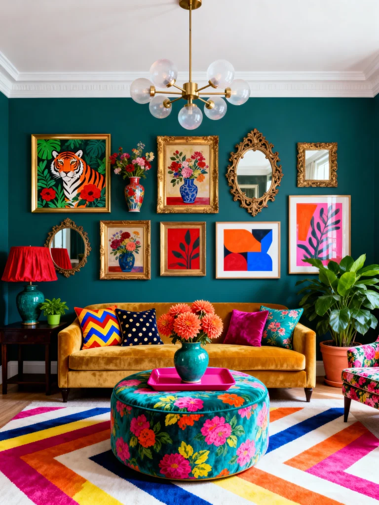 Now this is how you do a gallery wall. Mixing ornate gold frames with modern abstract prints and even a tiger? Yes, please! The mustard velvet sofa is the perfect “neutral” (if you can call it that) to sit beneath all that art. And check out that floral ottoman—it’s basically a piece of art itself. This room isn’t just a place to sit; it’s a curated collection of everything the owner loves.