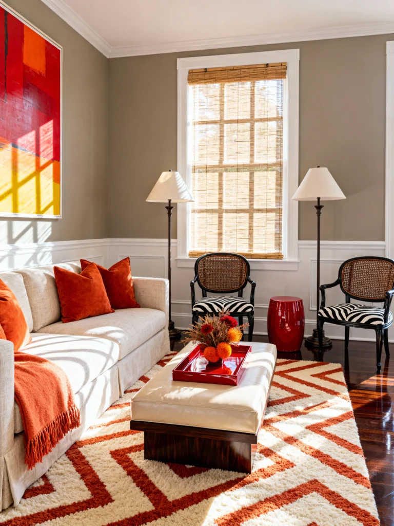 Maximalism doesn’t always have to be dark and moody. This room uses a neutral greige base but punches it up with high-contrast red and orange. The zebra-print chairs are such a fun, unexpected touch! It feels very “New York Apartment”—clean, sharp, but with enough bold texture in the rug and pillows to keep it from feeling cold.