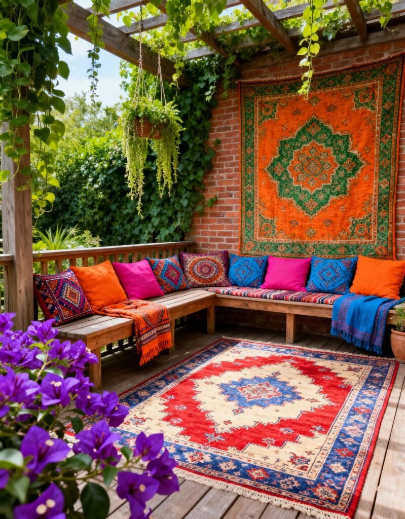 This ground-level setup is pure, relaxed boho perfection. That gorgeous orange and navy patterned rug anchors the whole space, piled high with comfy cushions for ultimate lounging. String lights overhead and flickering lanterns on the ground and side table create that magical, warm glow as dusk settles. Surrounded by lush potted ferns and succulents, it feels like a secret, enchanted garden nook. It’s the perfect scene for intimate chats or a quiet evening with a book.