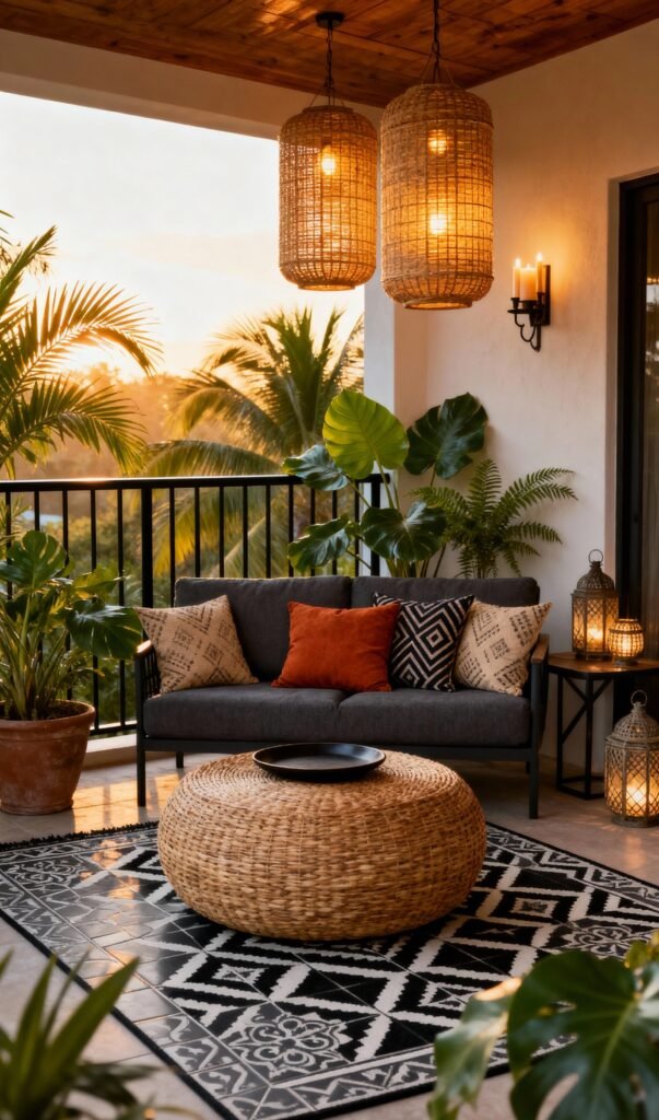 This setup is the definition of chic, tropical style. The contrast between the dark, modern sofa and the natural textures is spot-on. Giant woven pendant lamps provide a warm, ambient light, perfectly matching the large, round rattan coffee table/ottoman. The black and white patterned rug adds a graphic, modern edge that pops against the lighter floor tiles. Surrounded by large, vibrant green tropical plants and a view of the sunset through the palms, this balcony feels like a luxury resort. It’s elegant and totally relaxed at the same time.