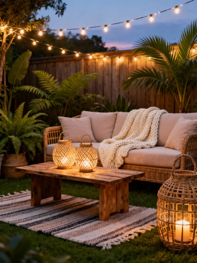 This is the ultimate tranquil evening space. The natural, light-colored rattan sofa with plush cushions looks incredibly inviting, especially draped with that chunky knit throw—perfect for a slight evening chill! The simple, rustic wooden coffee table provides a great anchor, and the woven lanterns glowing softly are key to creating that gentle, “firefly” atmosphere. Framed by tropical foliage and the soft string lights overhead, it feels like a secluded, intimate escape right in your backyard. It’s relaxed, natural, and utterly peaceful.