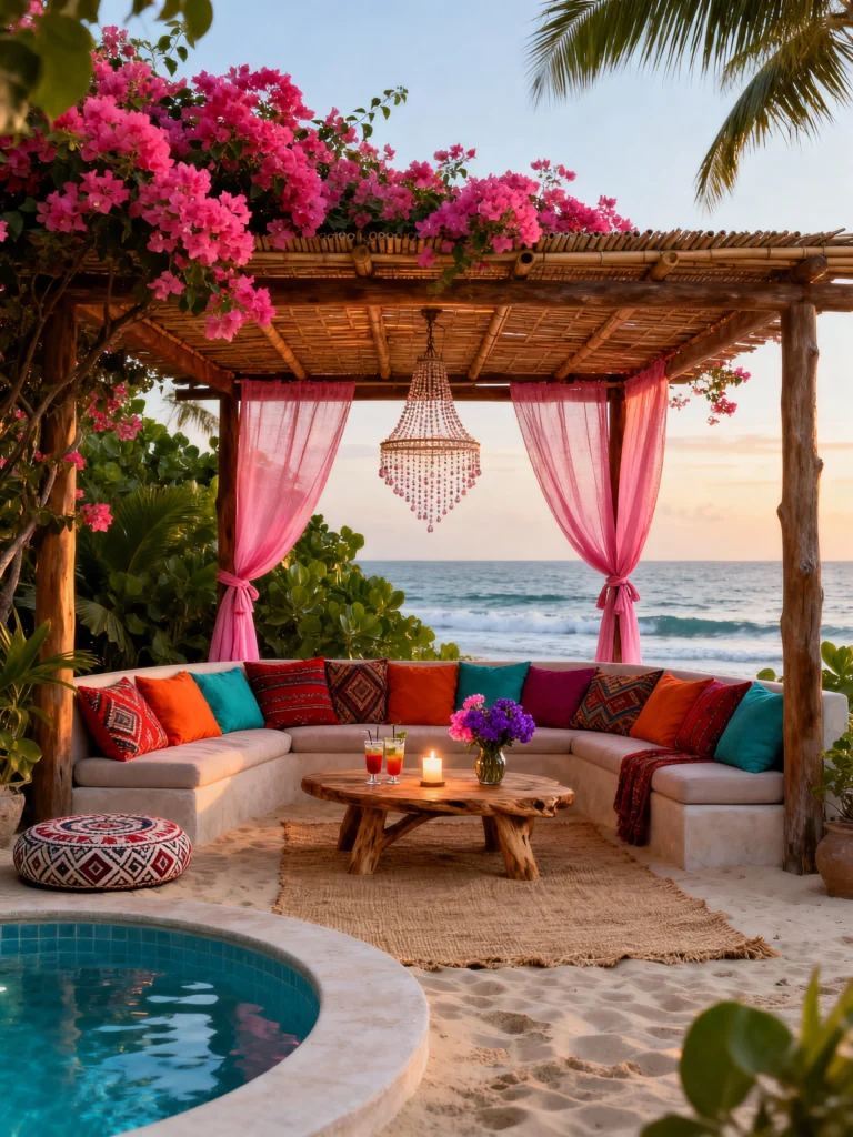 Seriously, who wouldn’t want to spend an evening here? This stunning beachfront setup feels like a private cabana straight out of a luxury destination. The semi-circular built-in seating piled high with bright, colorful cushions invites hours of relaxation. The bamboo pergola draped in sheer pink fabric and vibrant bougainvillea is breathtaking. The simple wooden table and woven rug keep the focus on the stunning ocean view and the incredible texture of the space. It’s romantic, exotic, and the ultimate escape from reality!