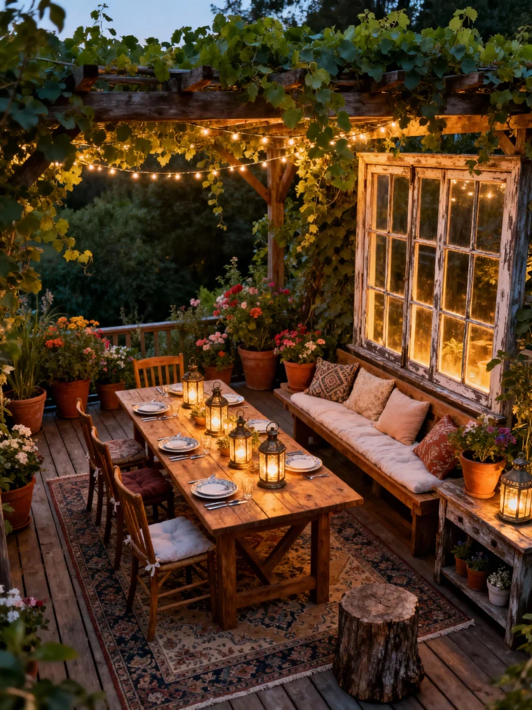 This setting is absolutely magical for an outdoor dinner party! The long, rustic wooden table is set beautifully with places for friends, illuminated by multiple brass-style lanterns that cast a warm, intimate glow. The bench seating, cushioned for comfort, runs along a charmingly distressed window frame backdrop. Overhead, the pergola is heavily draped with lush grapevines, creating a natural, enchanting canopy. Surrounded by potted flowers and string lights, it feels like a romantic dinner straight out of a storybook.