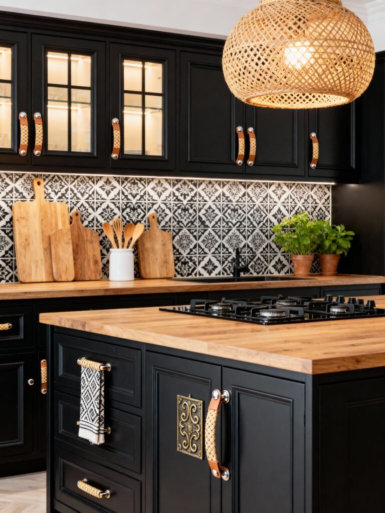 This kitchen is the perfect example of how to make black cabinetry feel approachable and lived-in. What really catches my eye here are those textured details. The oversized woven pendant light and the leather-and-wicker door pulls soften the dark faces of the cabinets beautifully.