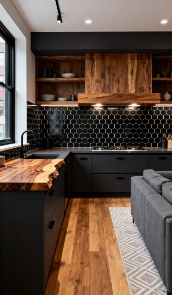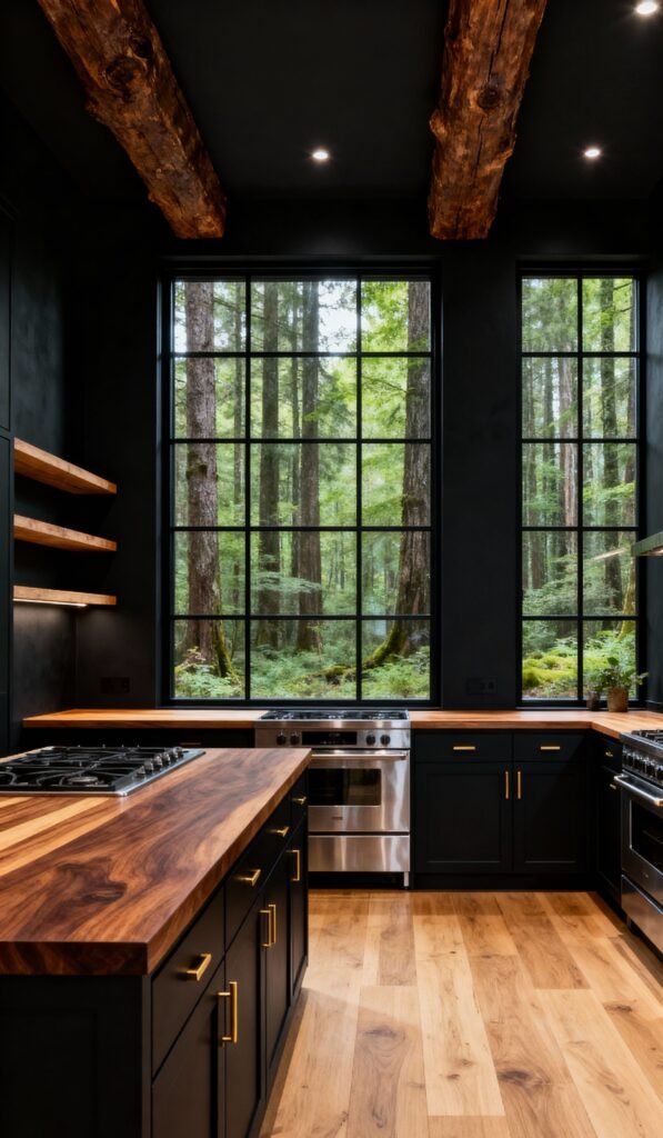 Have you ever seen a kitchen that just stops you in your tracks? We’ve been noticing a serious trend lately that brings together the best of bold, modern style and warm, rustic charm: the Black and Wood kitchen. It’s the perfect blend of high contrast, coziness, and pure drama. f you’re thinking about a renovation or just love gathering stunning inspiration (like us!), you’re going to adore this gallery. Take a peek at how these spaces masterfully combine sleek black cabinetry with every type of beautiful wood imaginable—from reclaimed barn wood to rich, polished walnut. Get ready to feel inspired!