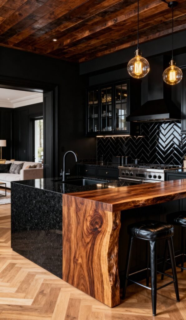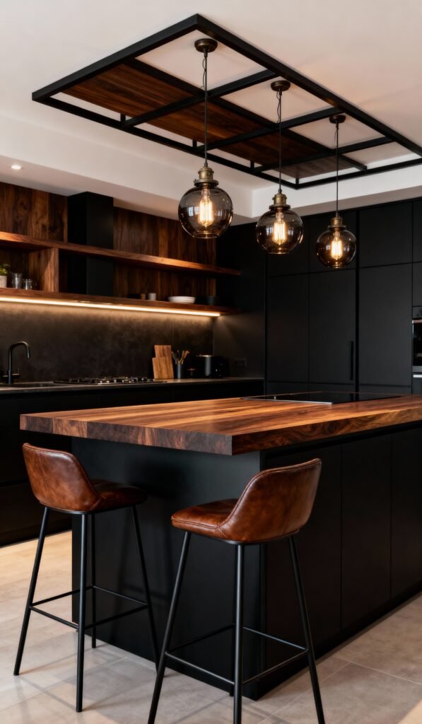 This one feels super sophisticated and slightly moody. The solid black cabinetry and backsplash provide a continuous, sleek foundation, but the rich, dark walnut countertop and open shelving bring in that necessary warmth. The clever lighting—from the under-cabinet strip to the gorgeous globe pendants suspended within that dark wood ceiling frame—makes the whole space glow. The leather-seat bar stools are the cherry on top, adding texture and a touch of vintage flair. It’s proof that dark design can still be incredibly inviting!