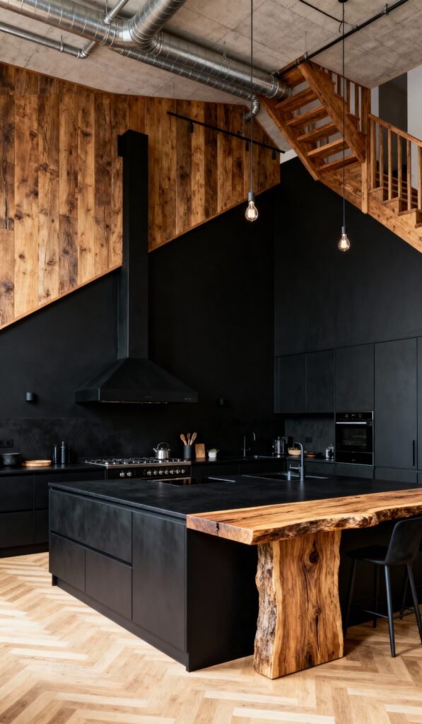This kitchen is serving up serious industrial-loft energy. The matte black cabinets and towering range hood create a dramatic, modern backdrop that makes the reclaimed wood accent wall and angled staircase truly pop. Check out that incredible live-edge wood bar top—it perfectly softens the sleek black island and adds a natural, organic touch. Plus, the exposed ductwork and simple pendant lights are the perfect final touches for this urban, high-contrast look. It’s bold, beautiful, and absolutely unforgettable.
