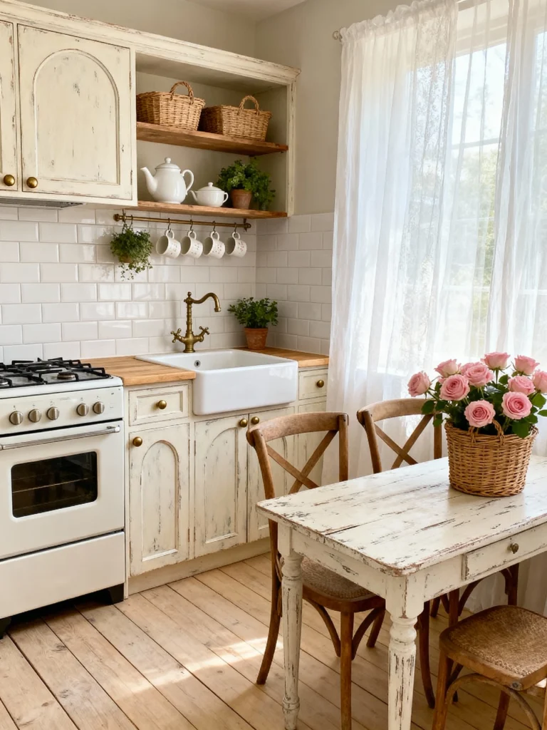 This is the ultimate shabby-chic setup! The distressed, antique-look cabinets and wooden farmhouse table give this kitchen a wonderful vintage soul . The light wood floor and sheer curtain create a bright, soft atmosphere. I adore the little touches like the brass rail for hanging mugs and the open shelving with woven baskets—it feels so homey and organized. The small white range is a charming detail, and of course, the vibrant pink roses bring a fresh, romantic energy to the whole space. It’s simple, sweet, and feels like stepping into a peaceful, sunny cottage.