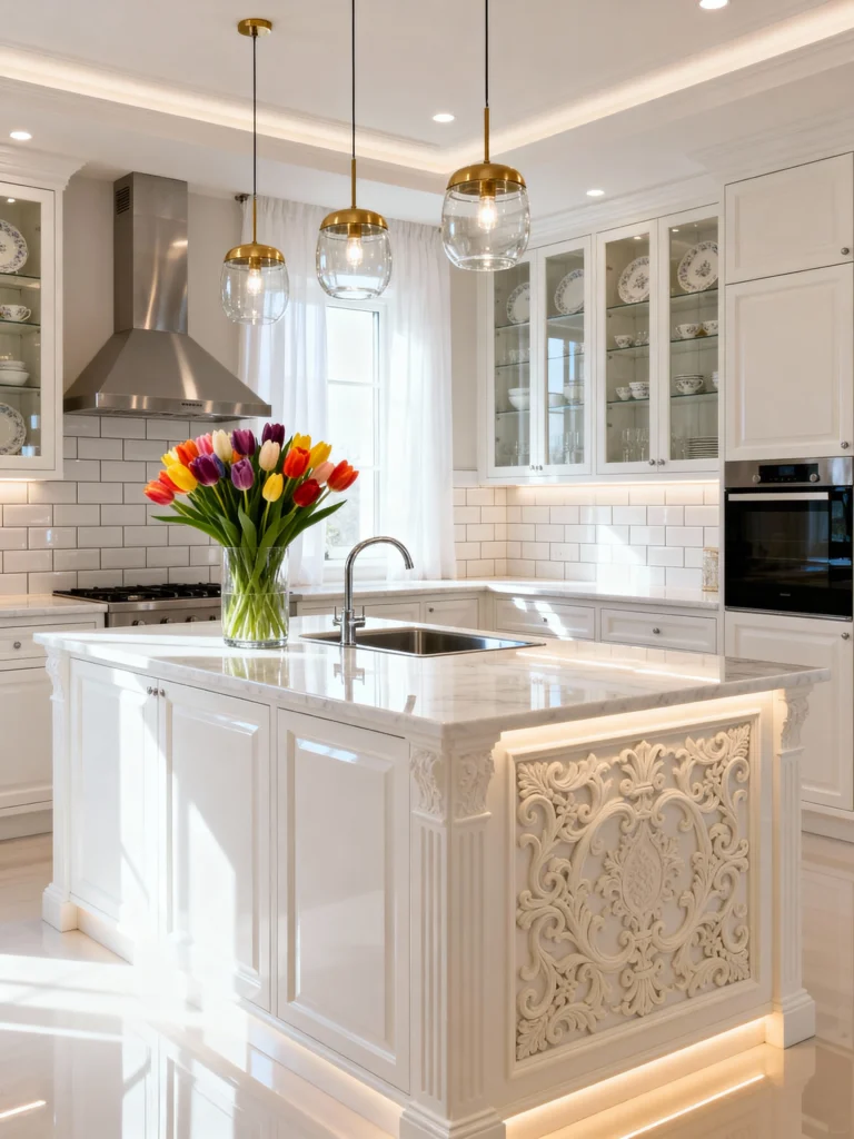This kitchen is seriously stunning! It maintains the classic white look but amps up the modern factor with those sleek brass and glass pendant lights. The oversized island is a masterpiece, featuring that incredibly detailed, intricate carved panel that takes it from simple to spectacular. The subtle under-island lighting gives it a cool, floating effect—super chic! Against the clean white subway tile, the colorful tulip bouquet adds a vibrant burst of life. I love the glass-front upper cabinets for displaying pretty dishware. It’s a perfect blend of traditional elegance and contemporary sophistication.