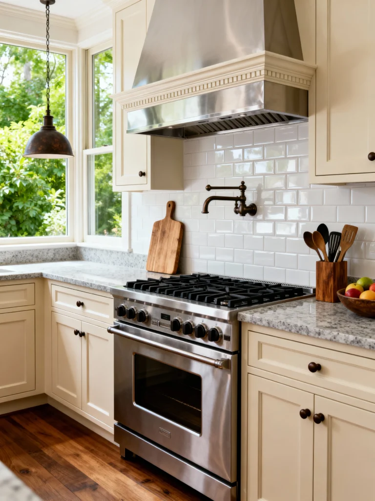 This space is for the serious cook! The large, stainless steel range and matching professional hood immediately grab your attention . The contrast of the cream-colored cabinets with the cool stainless steel is a really sharp look. I’m obsessed with the bridge-style pot filler faucet mounted directly on the subway tile backsplash—it’s both stylish and incredibly functional! The dark, rustic pendant light adds an industrial farmhouse feel. The speckled granite countertops and rich hardwood floor complete this look, making it a perfectly balanced blend of rustic charm and professional-grade appliances.