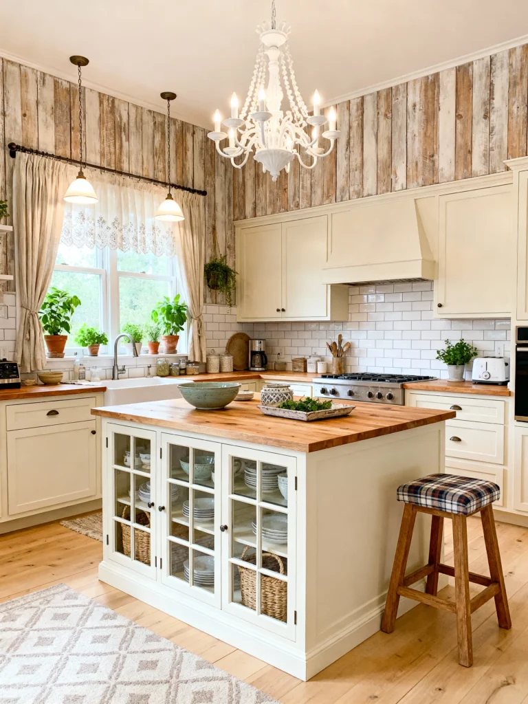 This kitchen has so much personality! The reclaimed wood wall panelling gives it that authentic, rustic farmhouse feel, perfectly complemented by the bright white and cream cabinets . The wooden island countertop provides a warm, natural texture. I also love the open feel created by the sheer, lacy curtains and the abundance of potted plants—it brings the outdoors in! That white chandelier is the perfect whimsical centerpiece. This space is cozy, lived-in, and absolutely charming. It’s the kind of kitchen that invites you to settle in with a cup of tea and stay a while!