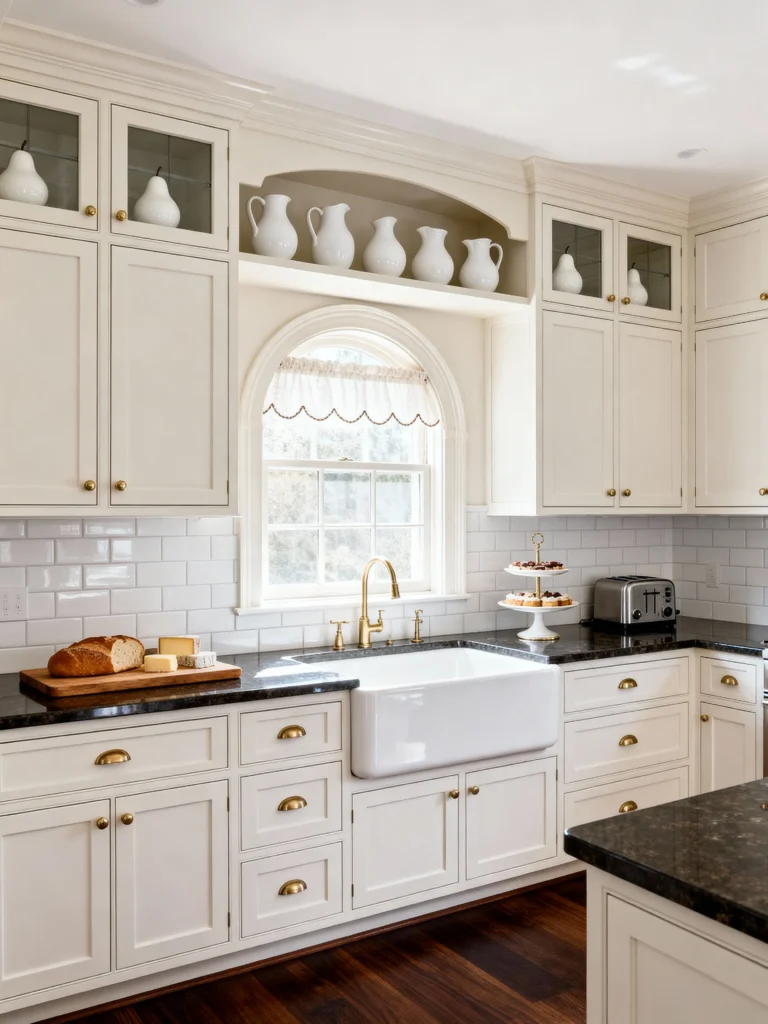 The contrasting dark countertops and bright cream cabinets in this kitchen are a beautiful pair. The warm brass hardware and faucet truly shine against the dark granite and white farmhouse sink. That arched window with the subtle curtain is a charming focal point, giving the sink area a lovely, bespoke feel. The little alcove above the window with the white pitchers is a great way to add decorative storage and height! The classic subway tile backsplash is a clean, timeless choice. This kitchen feels traditional and elegant, with just the right amount of warm metal to make it feel rich and inviting.