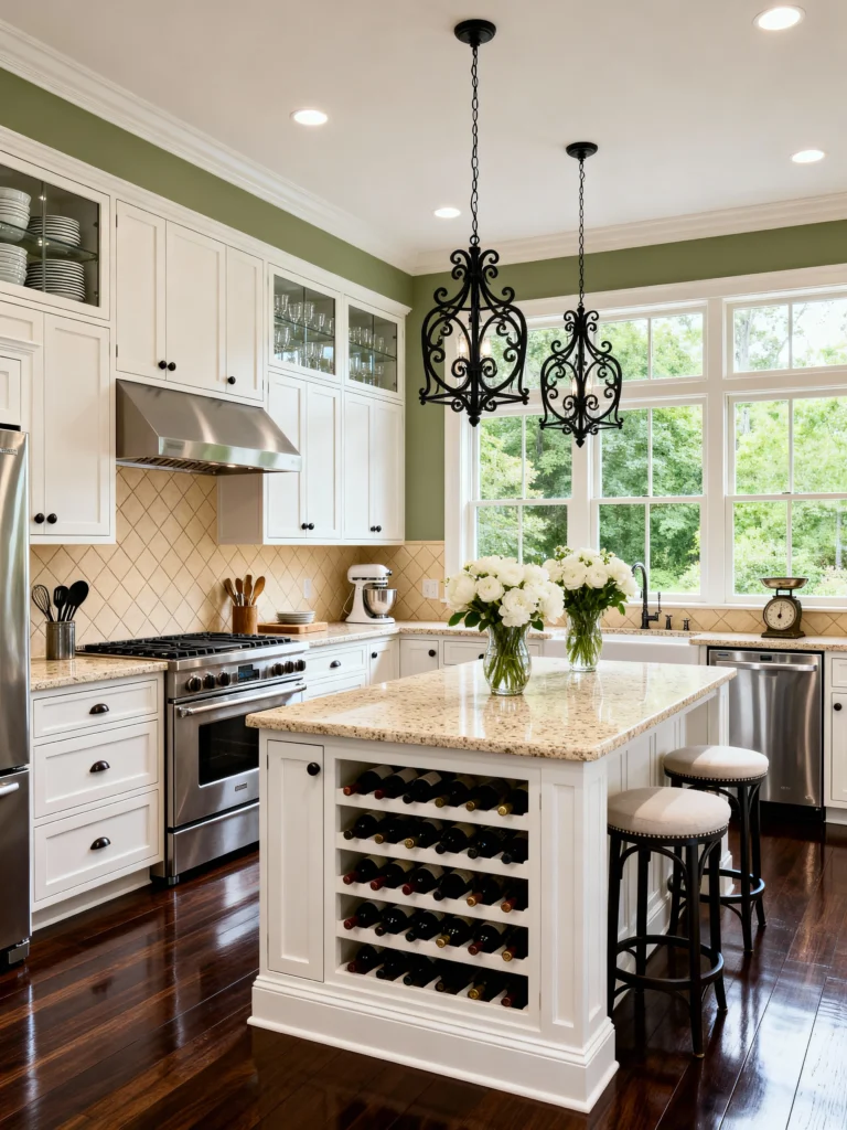 I love how the white cabinets pop against the soft green paint on the walls here! The dark, espresso-colored hardwood floors provide a strong, dramatic base. The light granite island, complete with a built-in wine rack, is both stylish and an amazing feature for entertaining! Black accents, like the striking iron chandeliers and cabinet hardware, create beautiful contrast. The diamond-patterned tile backsplash adds a unique texture, too. With that large set of windows bringing in tons of light, this kitchen feels crisp, bright, and perfectly balanced between light and dark elements.