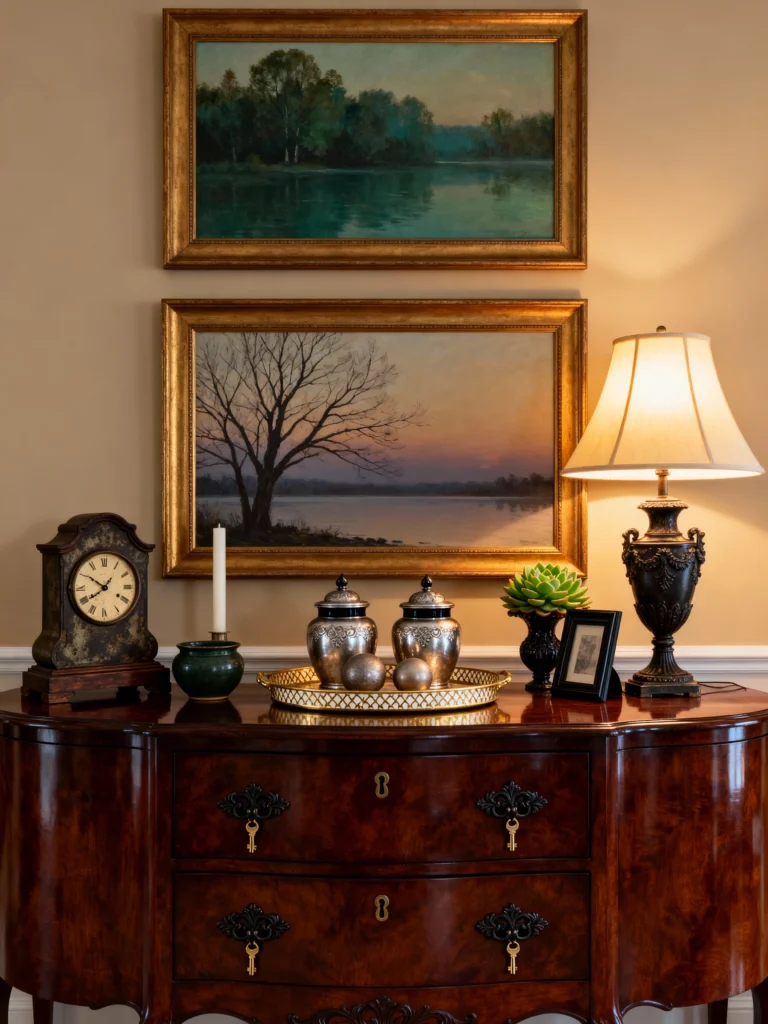 There is something so romantic about a symmetrical display. This rich, burl wood sideboard is stunning on its own, but the styling really elevates it. Using two similar landscape paintings stacked vertically is a great trick to fill a tall wall without it feeling cluttered. I’m obsessed with the brass accents here—the lamp base and the little keys in the drawer locks just sparkle under that warm light. It feels very “old world manor,” but the little succulent in the black urn keeps it feeling fresh and not too stuffy.