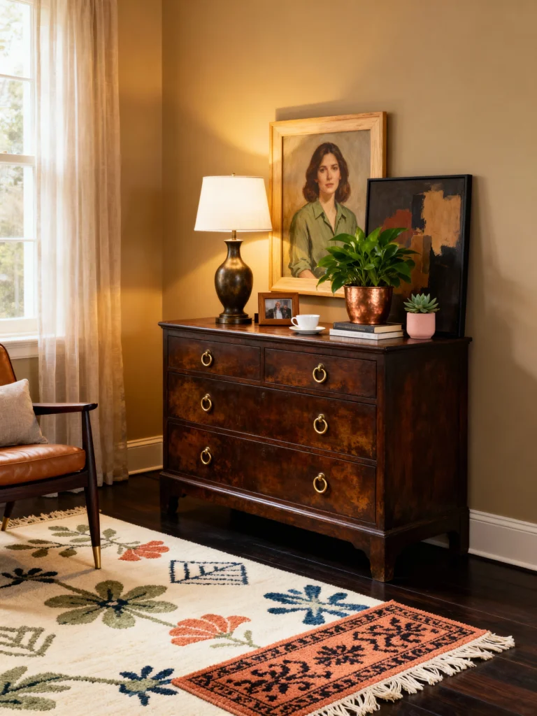If you find a portrait at a flea market, buy it! Even if you don’t know who the person is, they add instant character. This setup is all about layers. Notice how the larger portrait is leaning against the wall rather than hanging? It makes the whole space feel more relaxed and artistic. The dark, distressed wood of the dresser contrasts beautifully with the cream-colored rug. It’s a moody, soulful corner that feels like the perfect spot for a morning cup of coffee and some quiet reflection.