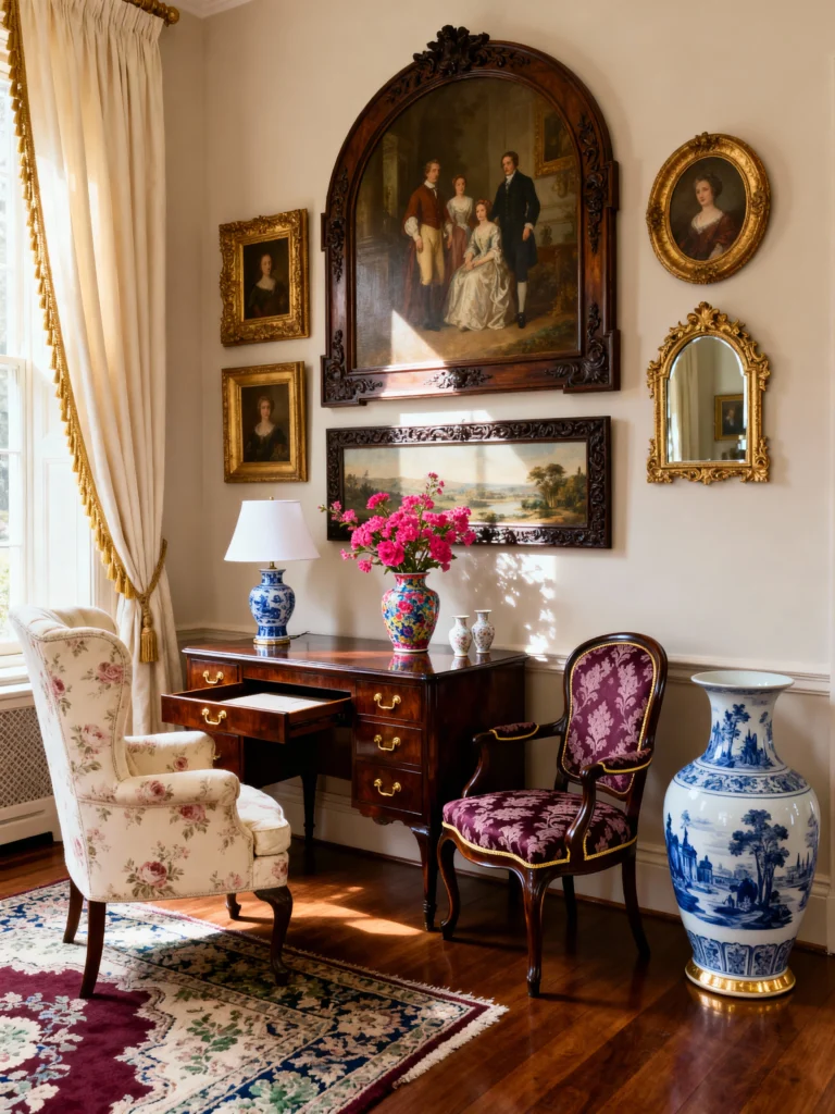 This is for the maximalists out there! This room is a masterclass in mixing patterns. You’ve got floral upholstery on the wingback, a deep plum damask on the side chair, and a classic oriental rug—and somehow, it all works. The massive arched portrait creates a huge focal point, making the ceiling feel miles high. My favorite detail? That giant blue and white porcelain floor vase. It adds a bit of “Chinoiserie” flair that makes the whole room feel incredibly curated and expensive.