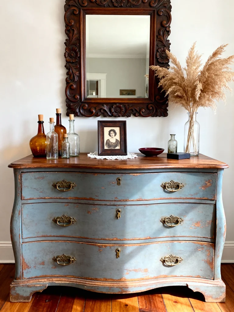 Let’s talk about that blue dresser! Sometimes the best find is the one where the paint is literally peeling off. This “shabby chic” look works because the furniture piece itself has such a beautiful, curvy shape. Pairing the rustic, weathered blue paint with a very dark, ornate wooden mirror creates a cool contrast between “rugged” and “fancy.” Keeping the top simple with just some vintage amber glass bottles and a bit of dried pampas grass keeps the focus on the texture of the wood.