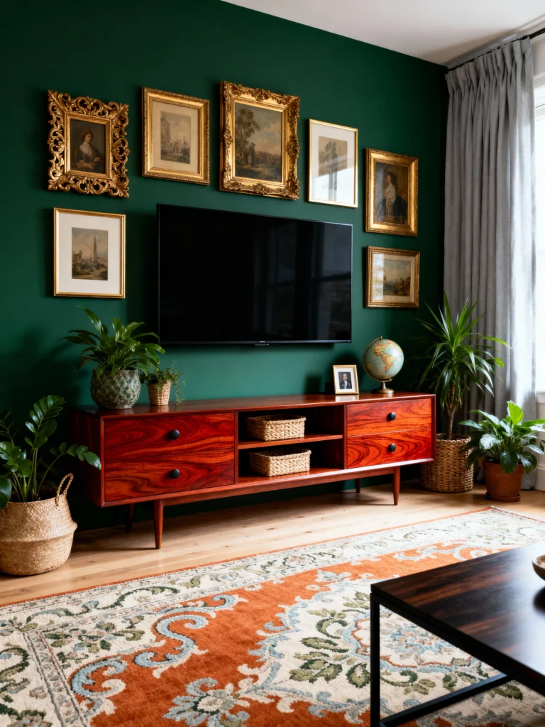 Who says vintage doesn’t work with tech? This is how you handle a TV wall. By painting the wall a deep, hunter green and surrounding the screen with gold-framed vintage sketches, the TV almost disappears into a gallery wall. The mid-century modern sideboard underneath brings in those warm wood tones that look so good against green. It’s the perfect blend of 1960s sleekness and 1860s art. It’s sophisticated, cozy, and very “grown-up.”