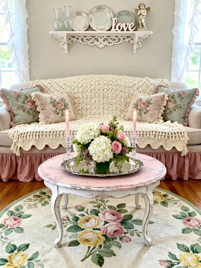 The central feature is that gorgeous, hand-painted coffee table, with its distressed finish and soft floral motifs. It perfectly coordinates with the stunning floral rug underneath. The sofa, draped in a chunky crochet throw and skirted with a pink ruffle, looks incredibly inviting. Everything here—from the two lit candles on the table to the “love” sign on the shelf and the cherub figurine—is arranged with intention, creating an atmosphere of warmth and affection. It’s a sweet, cozy look perfect for a loving home.